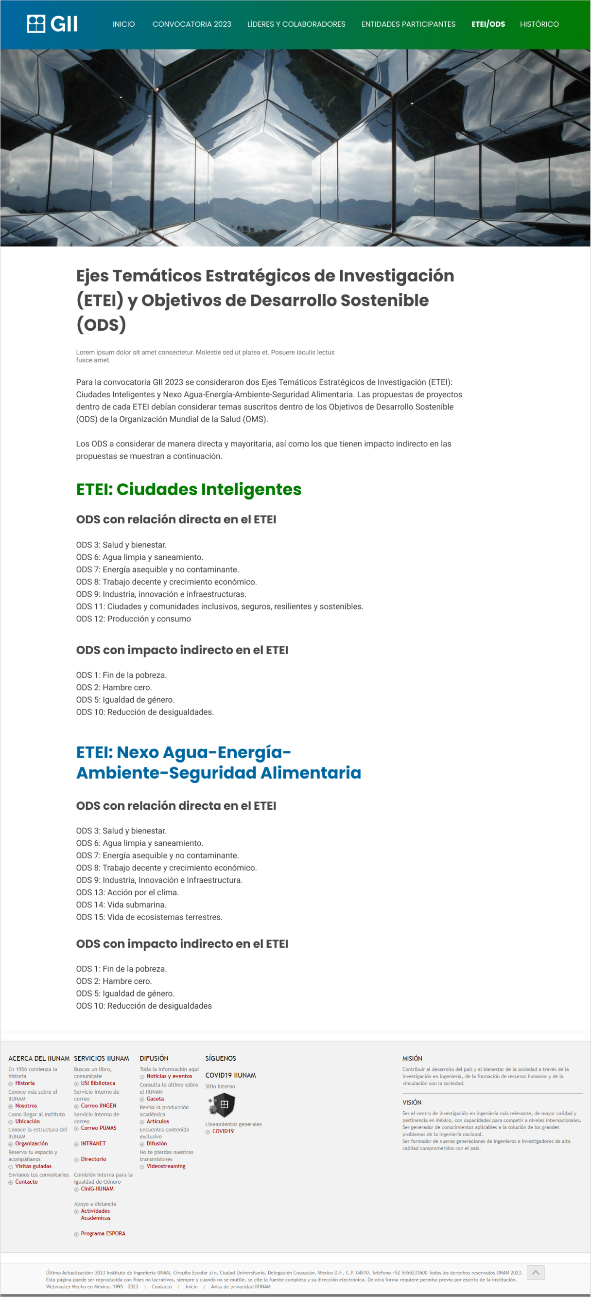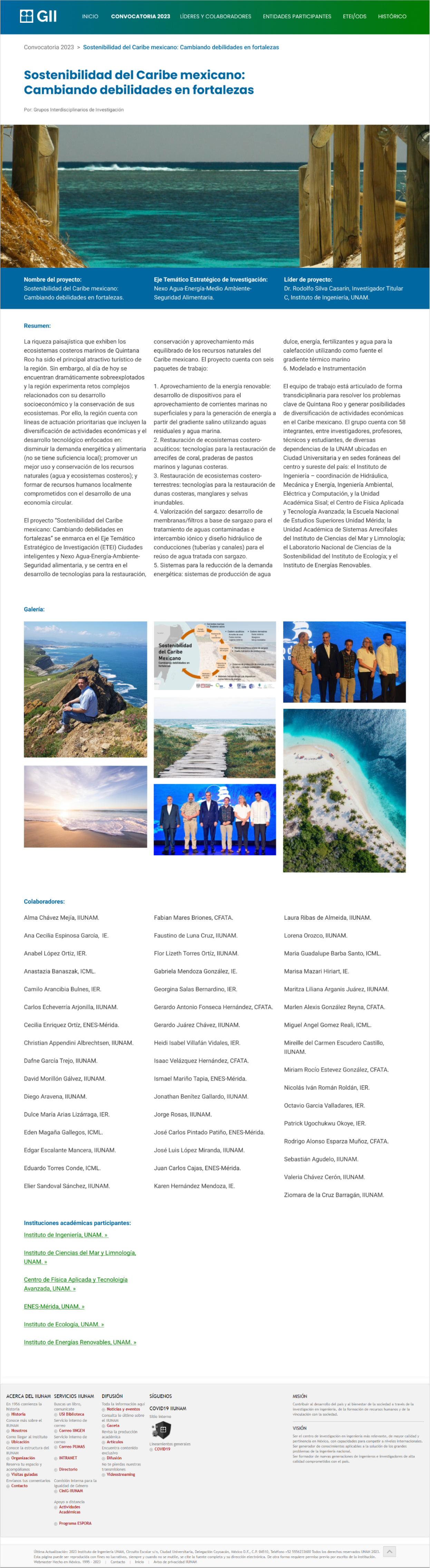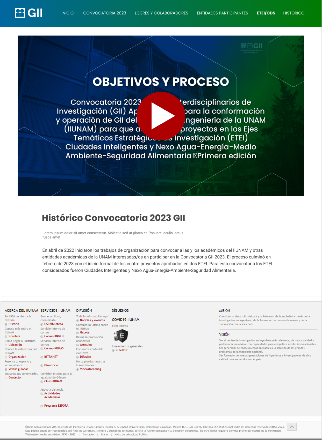 In April 2022, the organization work began to invite academics from the Institute of Engineering at UNAM and other interested academic institutions to participate in the call. This process culminated in February 2023 with the official start of four approved projects. As part of this drive for the Interdisciplinary Research Groups (GII), the creation of a website has been requested to serve as a platform to promote and highlight the GII, their coordinators, collaborators, and the projects that will be developed within them. Currently, four projects have been approved in this call.