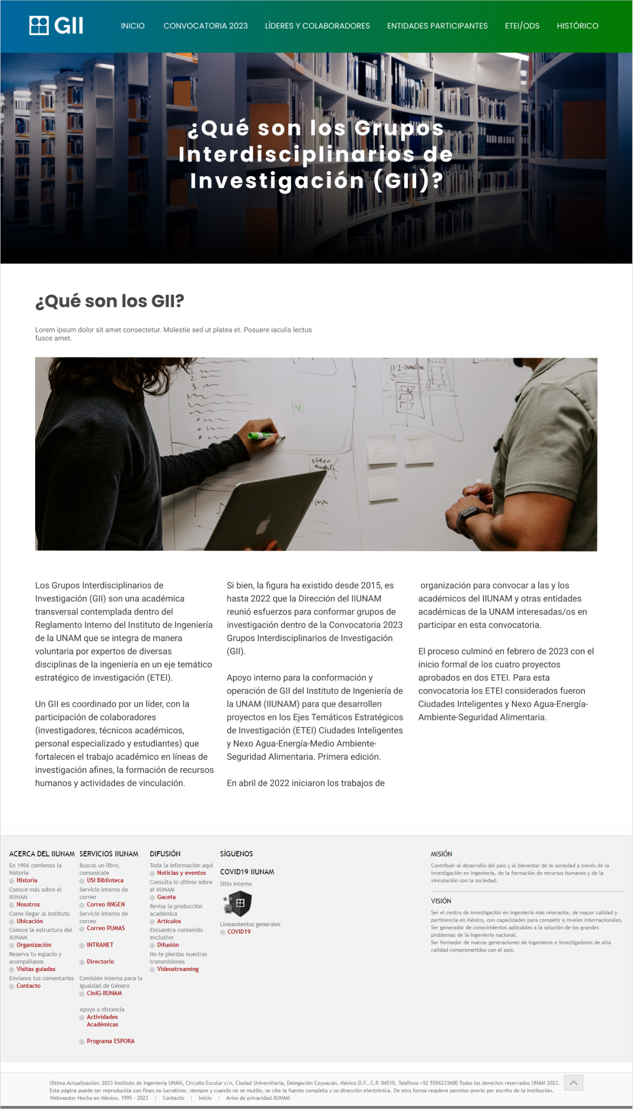 IIUNAM is driving the creation of a dedicated web portal for the Interdisciplinary Research Groups (GII) with the goal of promoting, highlighting, and sharing the projects, achievements, and history of these groups. Through this platform, the aim is to enhance visibility and collaboration among GII members, thus fostering advancements in research and development in the field of engineering in Mexico.