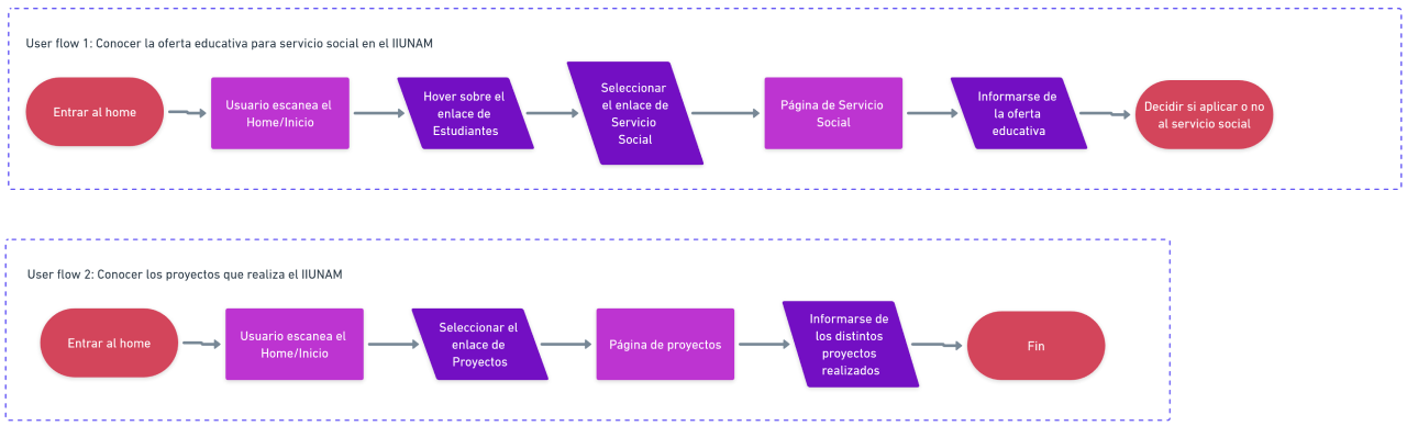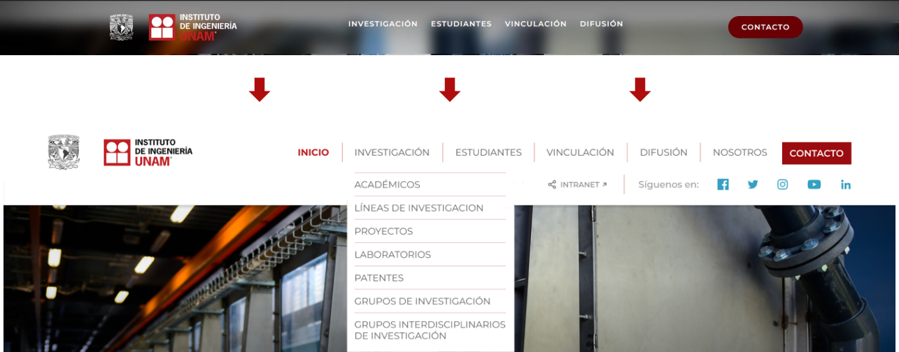 Similarly, the use of a dropdown menu is proposed to facilitate information search for users. Below the navigation menu, the addition of a social media contact bar and a direct link to the INTRANET for IIUNAM members has been suggested.