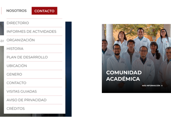 The IIUNAM website is developed using the SharePoint CMS, and a predefined navigation was implemented beforehand, which, due to legal reasons, cannot be altered. Faced with this situation, IIUNAM chose to create a custom homepage that didn't rely on the options provided by the CMS. However, over time, user dissatisfaction was noticed as they couldn't easily find the site's content on the homepage.