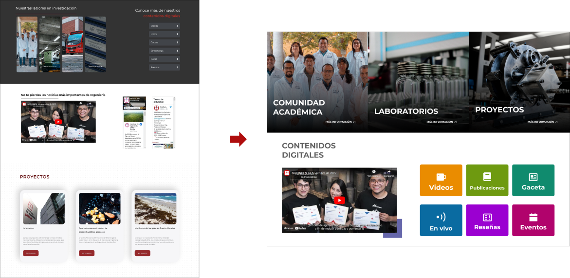 For the Research Activities and Digital Content sections, it was proposed to discard the research groups part, as it can already be accessed from the menu and the GII section. This shift emphasizes the academic community, laboratories, and projects.